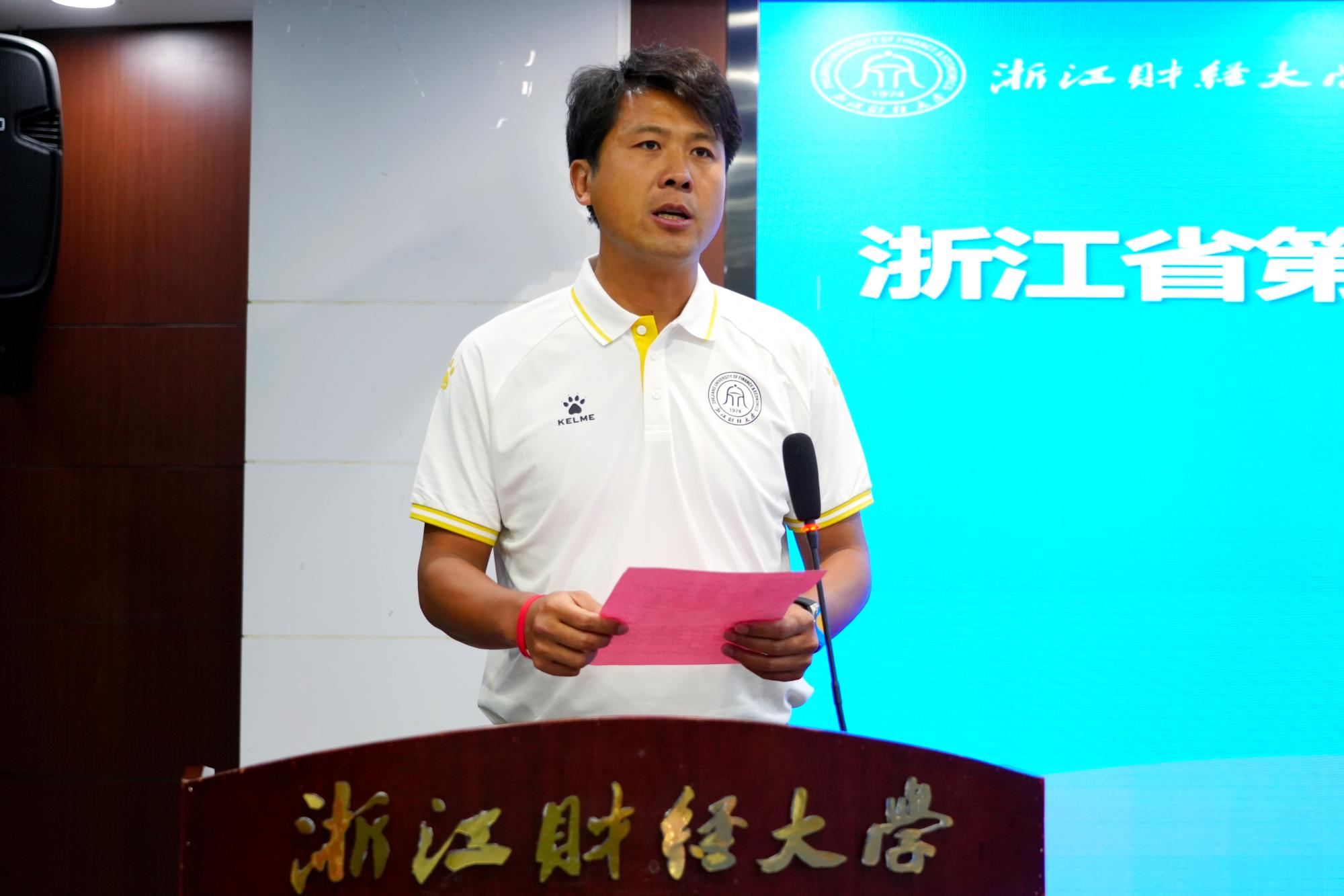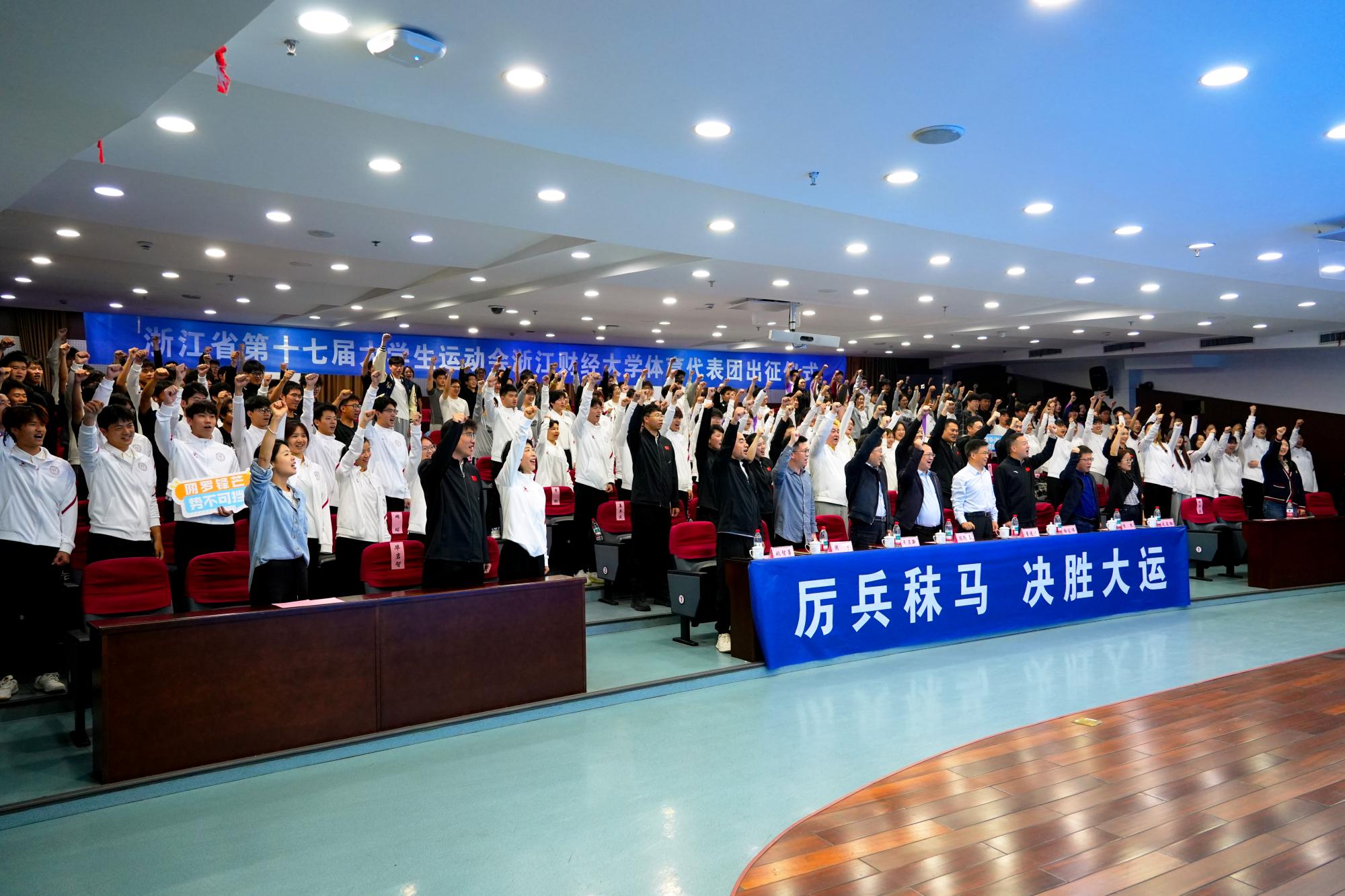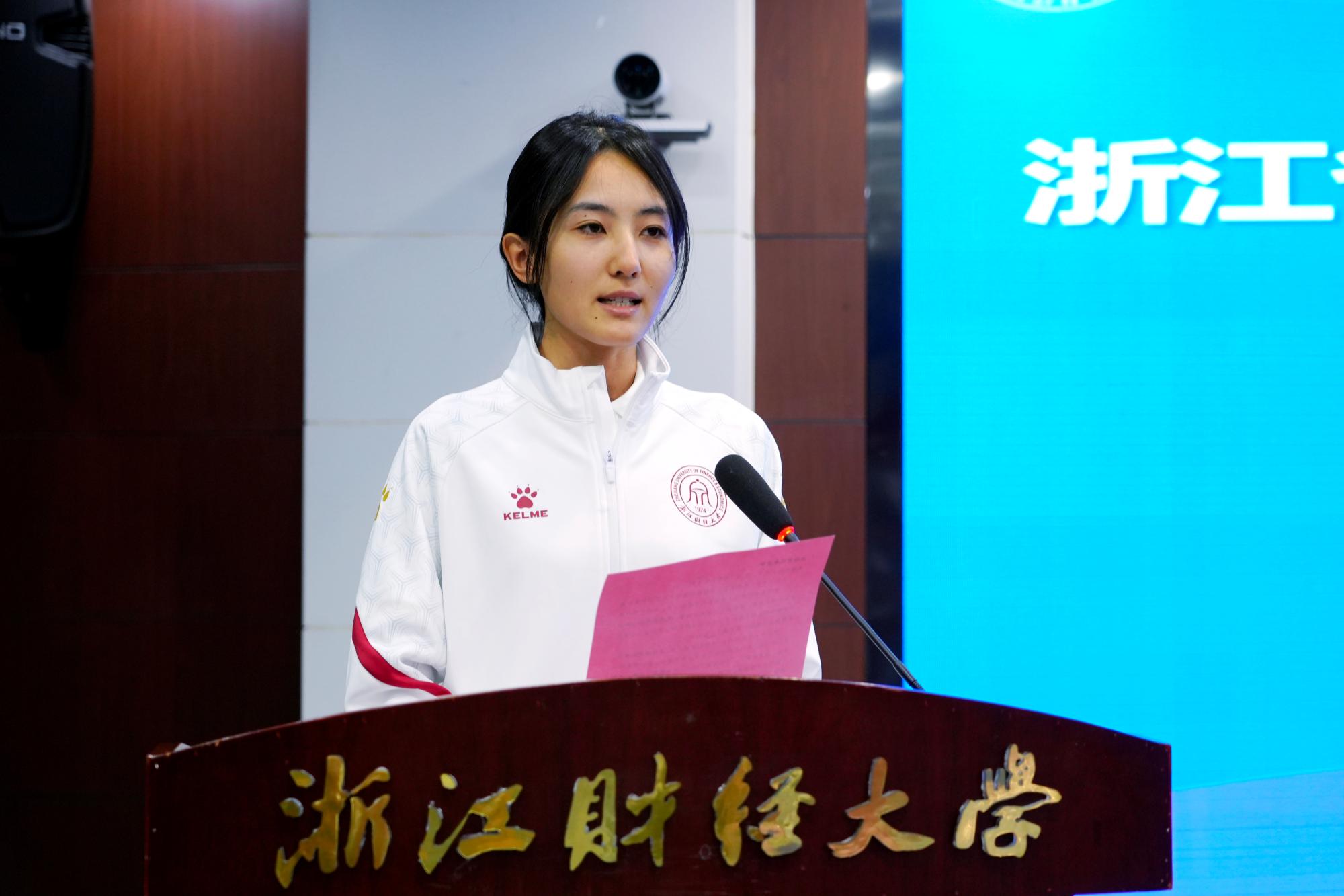 男子足球队教练员、体育部教师赵泽溪,女子足球队队员、公共管理学院学生雷佳鑫分别作为代表团教练员和运动员代表发言。在运动员代表的带领下,全体教练员、运动员高举右拳,庄严宣誓,铿锵有力的誓言响彻会场,彰显了浙财体育人奋勇拼搏、不负使命的坚定决心。