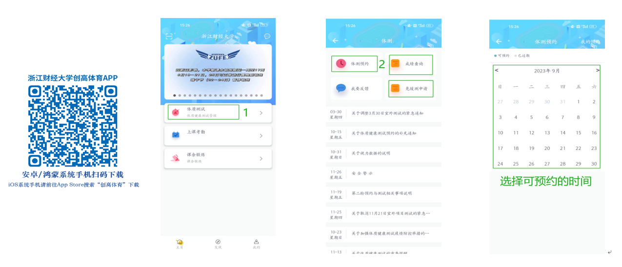 (2)预约时间:体质测试→体测预约→选择时间、输入预约信息→确定预约。(验证:我的预约→查看成功预约的时间段);